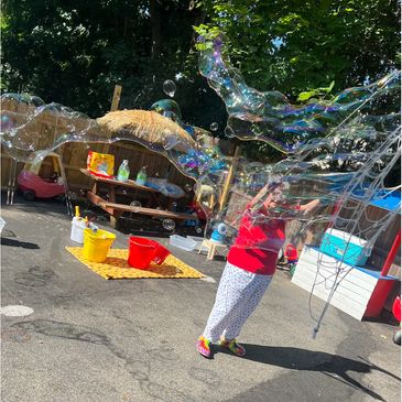 Extra large numbers and/or sizes of gigantic bubbles various styles of bubble nets on 7 foot poles that wow the youngest to oldest observer. Usually elicit long wows and lots of fun . Also offered to some audiences are bubble tricks like bubbles in bubbles, bubbles that aren't circular, spinning bubbles, etc.